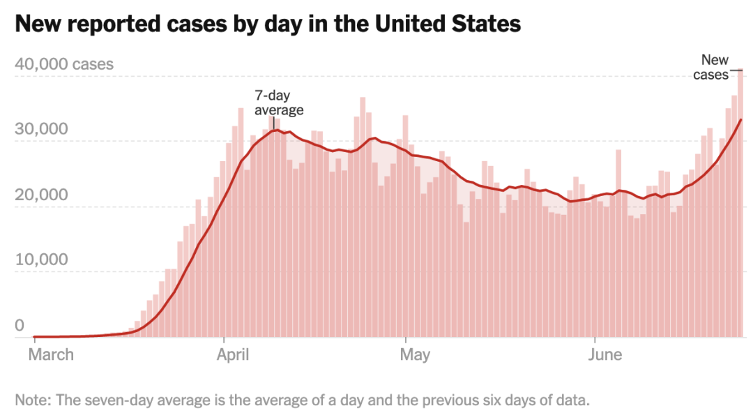 在五月份的几周内,美国新增确诊数虽仍处高位,但有了下降的趋势。自6月中下旬以来,反弹开始,且连日增长,6月25日,确诊人数超过4万,创下了美国疫情发展以来的新记录。