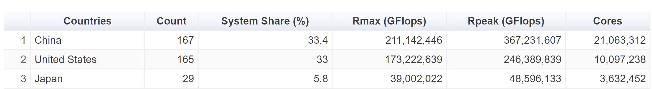 相比之下,美国进入TOP500的总套数165套,市场份额为33%,平均每套实际算力为1049834 Gflops,平均每套理论算力1493272 Gflops,效率为70%。