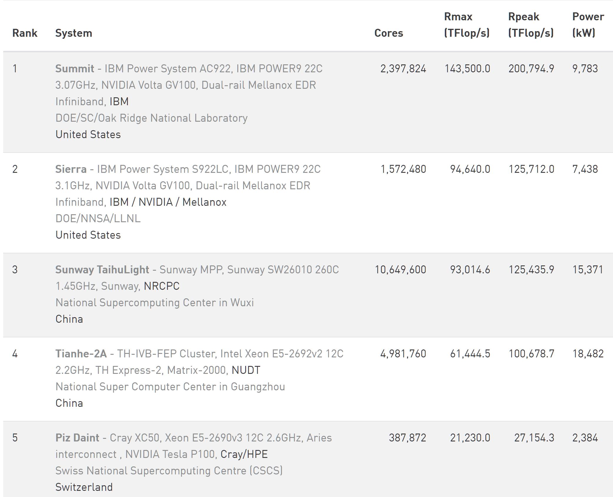 2018年6月超算TOP500前5排名