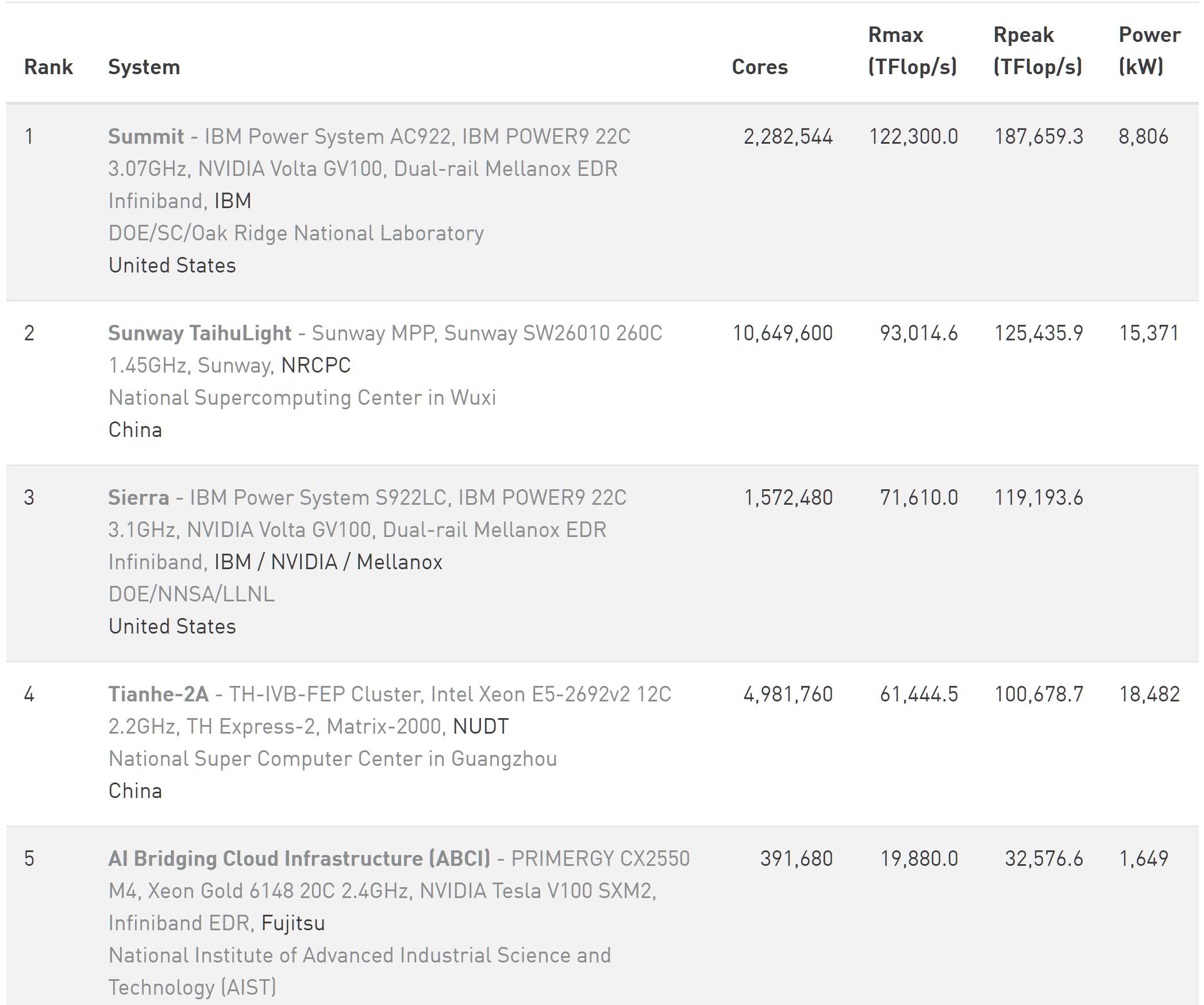 2018年11月超算TOP500前5排名