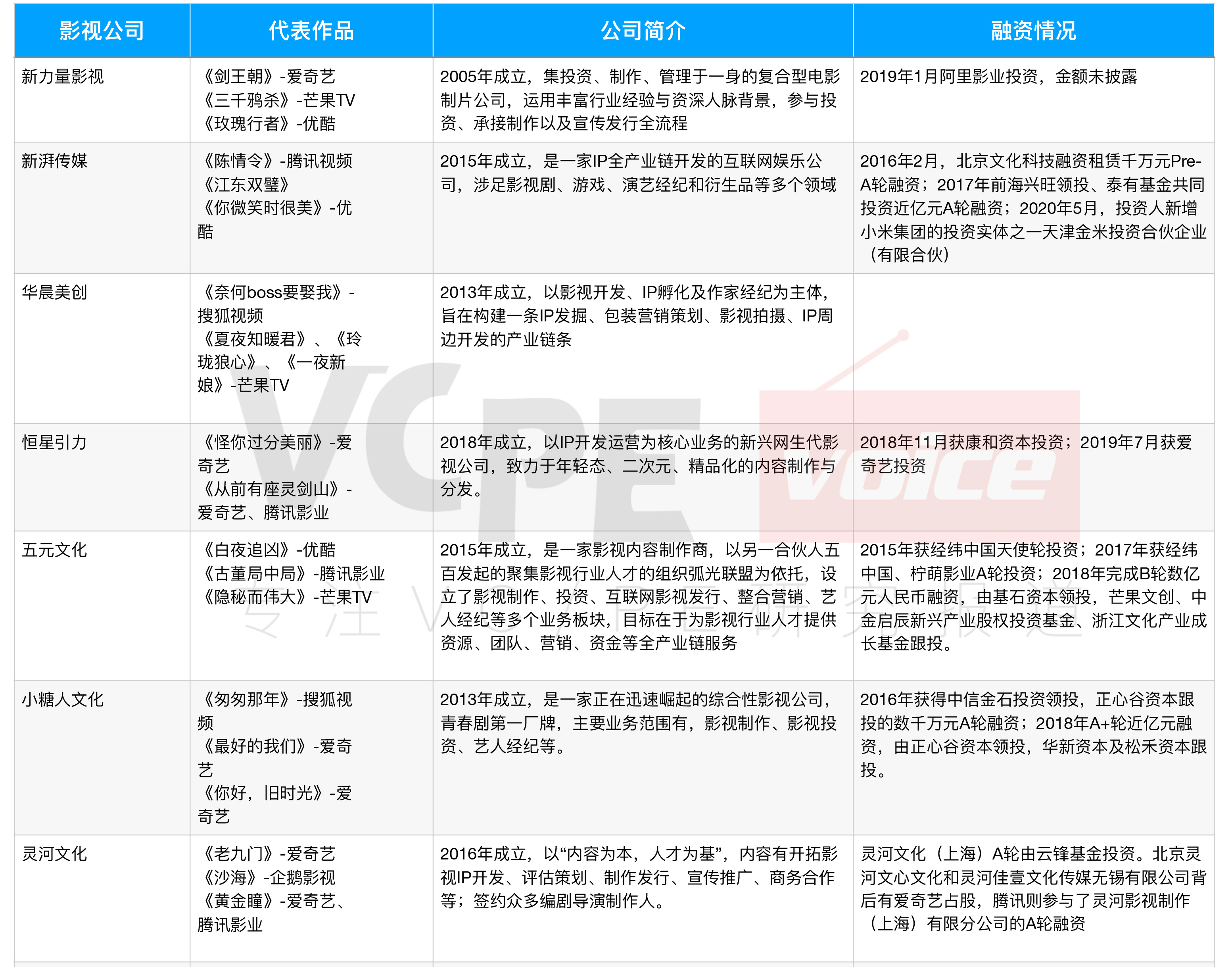除了这些网剧新贵,在中小影视公司市场中还有一些传统强队,如五元文化、小糖人、灵河文化、工夫影业、留白影视、新圣堂影业等。