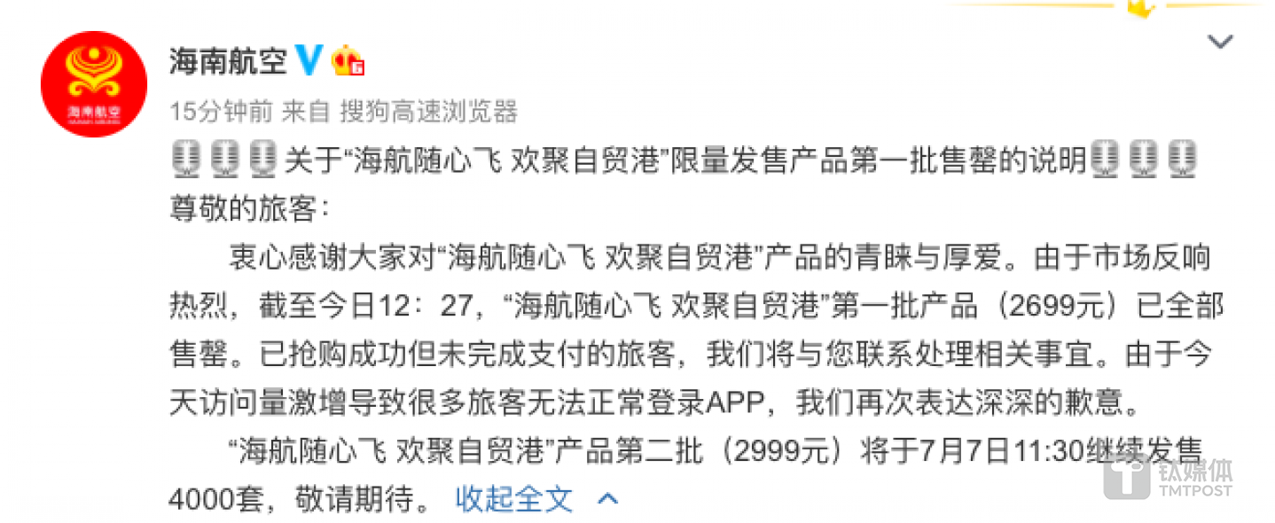 由于购买人数较多,导致其海航APP的访问量激增,海航还发布消息称,造成部分旅客无法正常访问,公司技术人员正在加紧优化系统。