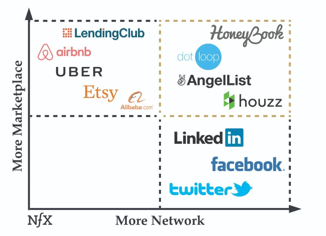 从商业化(货币化)的角度来看,市场网络也是独一无二的。它们结合了LinkedIn或Facebook等社交网络强大网络效应的防御性和可扩展性,以及SaaS或交易平台丰厚的收入模式。