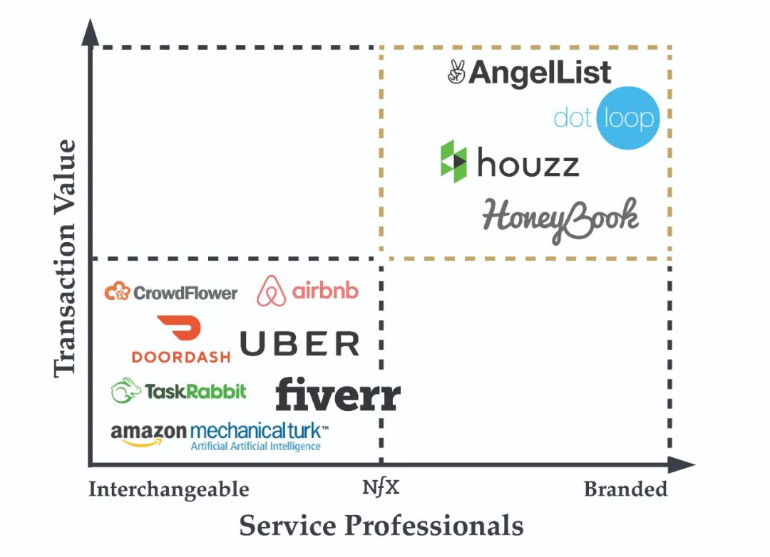 在过去的十年里,科技行业里涌现了一批按需劳动力市场类的公司,它们能够实现简单服务的快速交易。Uber、Lyft、Thumbtack、DoorDash等公司让购买简单服务的效率提高了,而且它们的服务质量是能够客观判断的。他们的成功是基于将市场双方成员的需求和服务商品化。