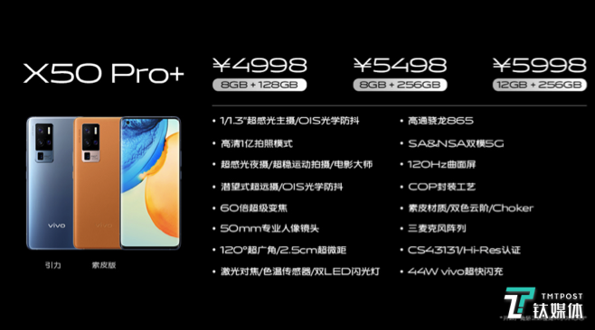 据悉,vivo X50 Pro+将于7月11日上市,其共有8G+128G、8G+256G、12G+256G三个版本可供选择,售价分别为4998元、5498元和5998元。(本文首发钛媒体,作者/Kiwi)