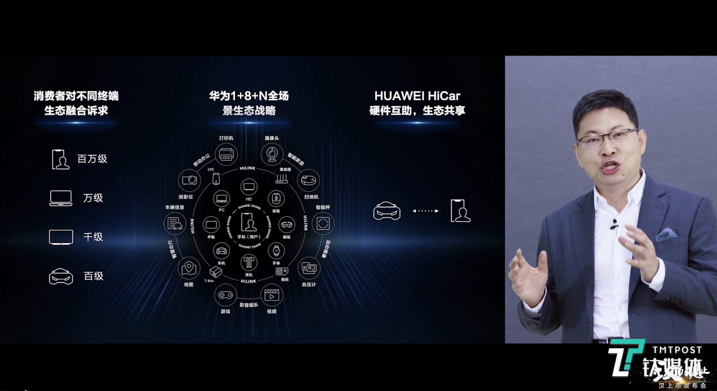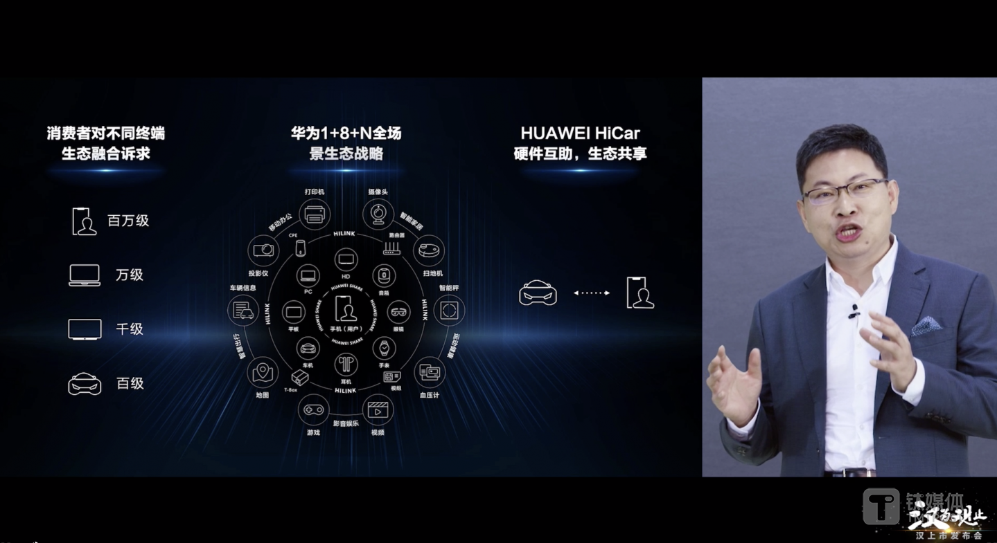 同时,余承东还指出,手机里面有百万级应用,PC有万级的应用,智能电视只有千级应用,而车只有百级应用。华为推出的Hicar解决方案,可以让百万级手机中的应用带入到智能汽车中。