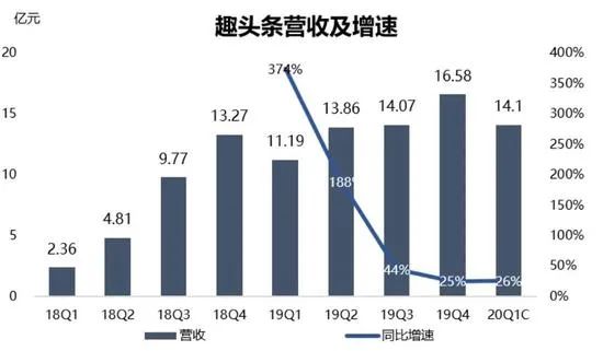 这表明,趣头条规模虽然在持续扩大,但用户增速却在不断下滑。这可能和自2019年三季度起,趣头条有意识地压缩获客与用户平均互动费用有关:2020年一季度趣头条日活用户的平均互动费用为0.12元,同比下降29.41%,环比下降14.29%。此外,2020年一季度趣头条获客成本为5.020亿,同比下降25.7%。