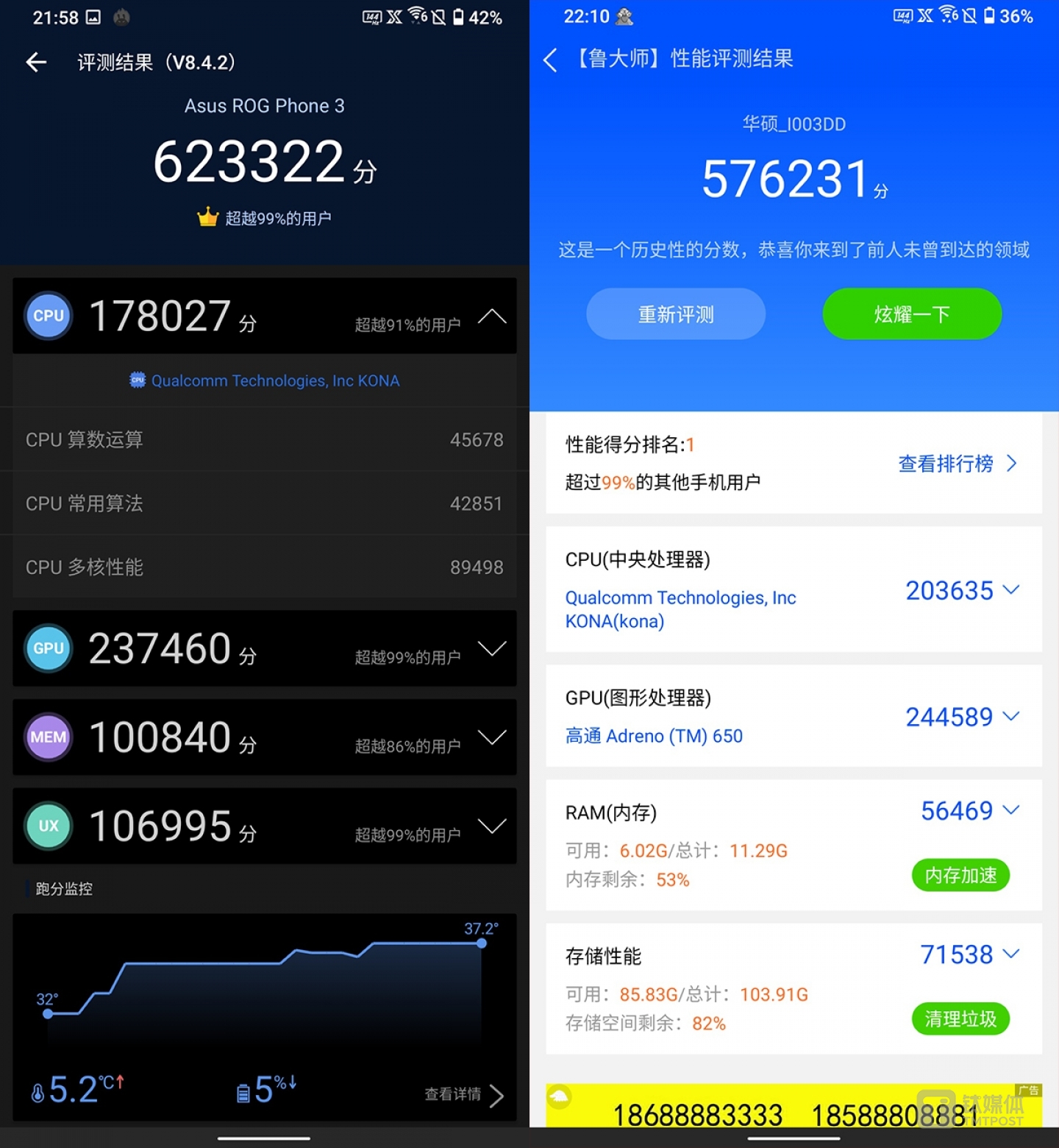 笔者用安兔兔和鲁大师两款性能测试APP对其进行了跑分测试,前者得分为62.3万,而后者跑分也为57.6万,同时在跑分过程中温度的控制也比较理想。