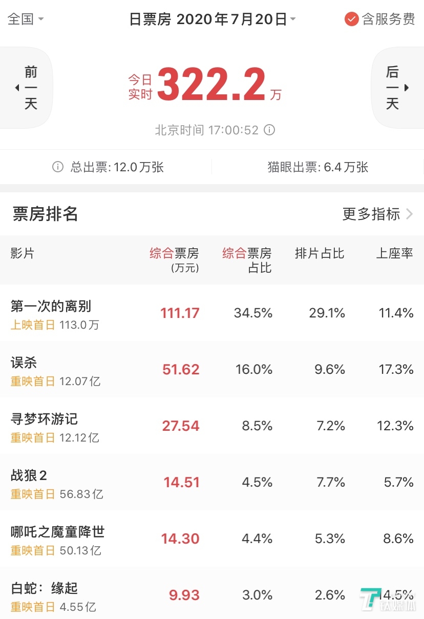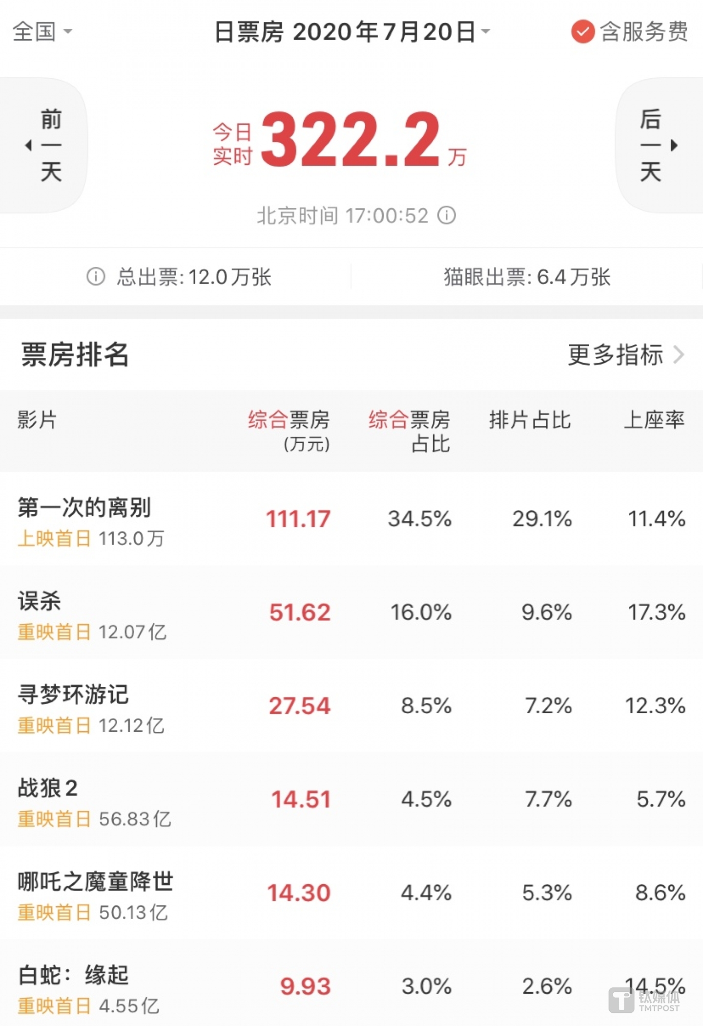 根据猫眼专业版数据显示,截止7月20日17点,全国影院复工首日票房达到322.2万。