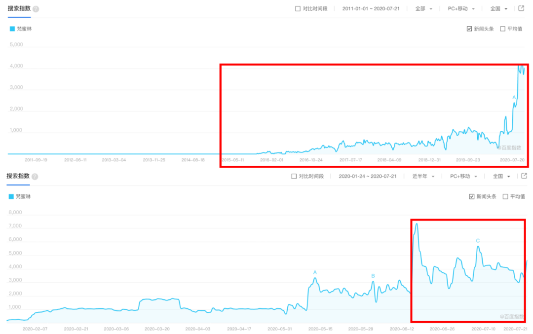 根据百度搜索指数来看,上图可以看到梵蜜琳从2015年开始成立,成立后一直波澜不惊,从去年开始慢慢有一点关注,直到今年6月中旬《乘风破浪的姐姐》播出,梵蜜琳这才被大众注意到,迎来了一个逆势攀升。