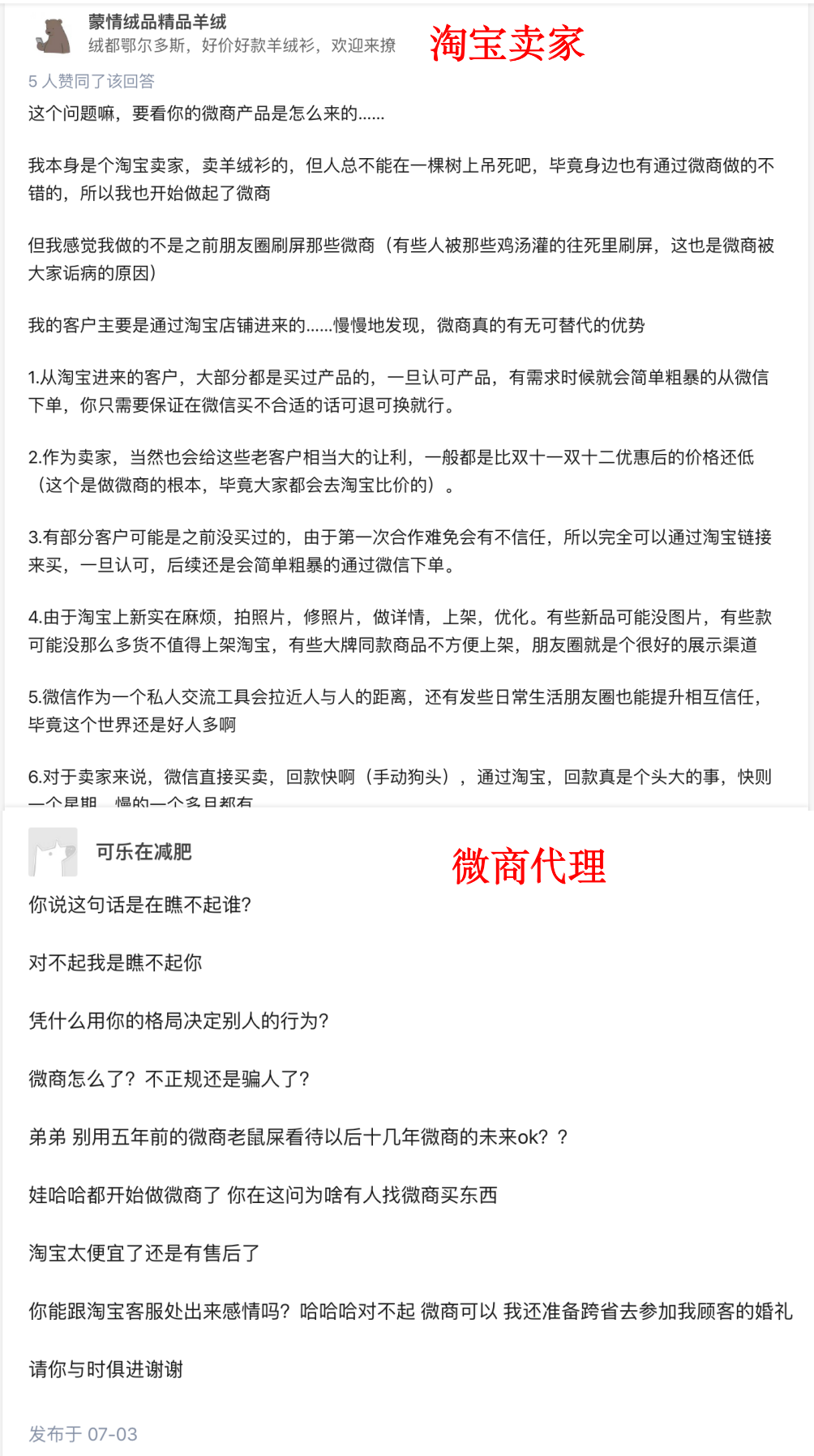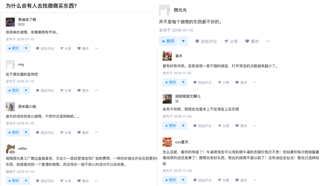 在知乎上也有人发起问题“为什么会有人去找微商买东西”?简单划分下不同视角的看法: