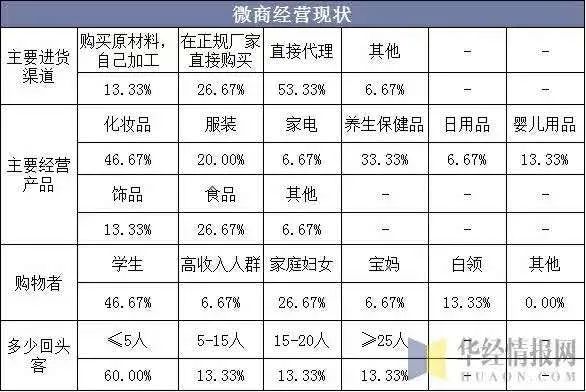 2.根据华经情报网数据显示,目前微商经营现状,化妆品占比46.67%、服装占20%、养生保健品33.33%、家电6.67%、婴儿用品13.33%、饰品13.33%、食品26.67%以及其他占6.67%。