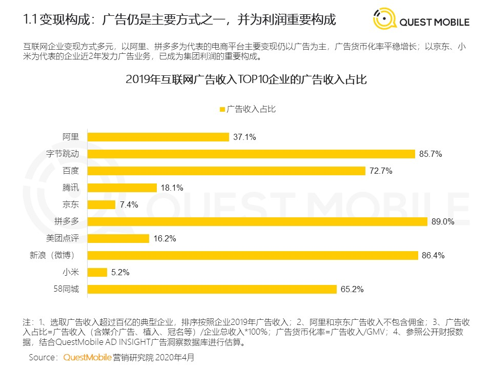 论用户数量,腾讯当之无愧的霸主,腾讯Q1财报最新公布的数据显示,微信及WeChat的合并月活跃帐户数达12.025亿,比去年同期上涨8.2%,但腾讯的广告收入占比一直都不算高,据QuestMobile2020年4月份的数据报告显示,腾讯2019年广告收入占比仅为18.1%,远低于同类其他公司,今年的第一季度财报中,广告业务占总营收仍不足20%。