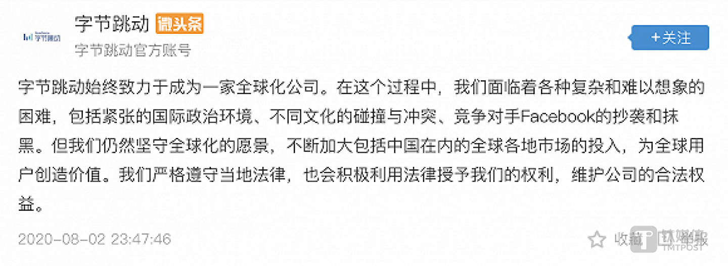 昨晚深夜,字节跳动也在其今日头条官方账号上发布了一条声明,称面对紧张的国际政治环境和竞争对手Facebook的抄袭抹黑,将积极利用法律维护公司合法利益。