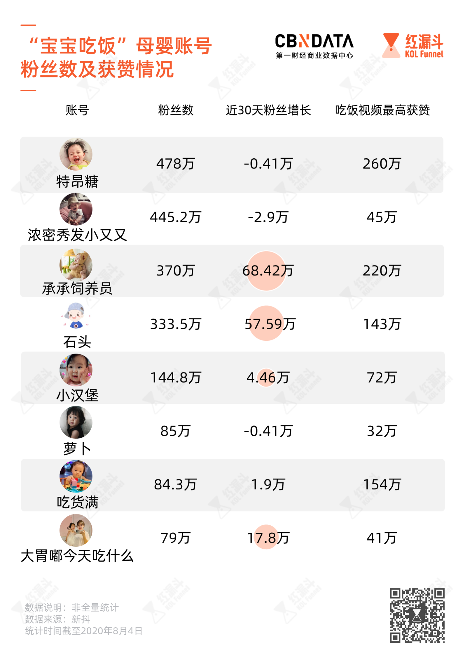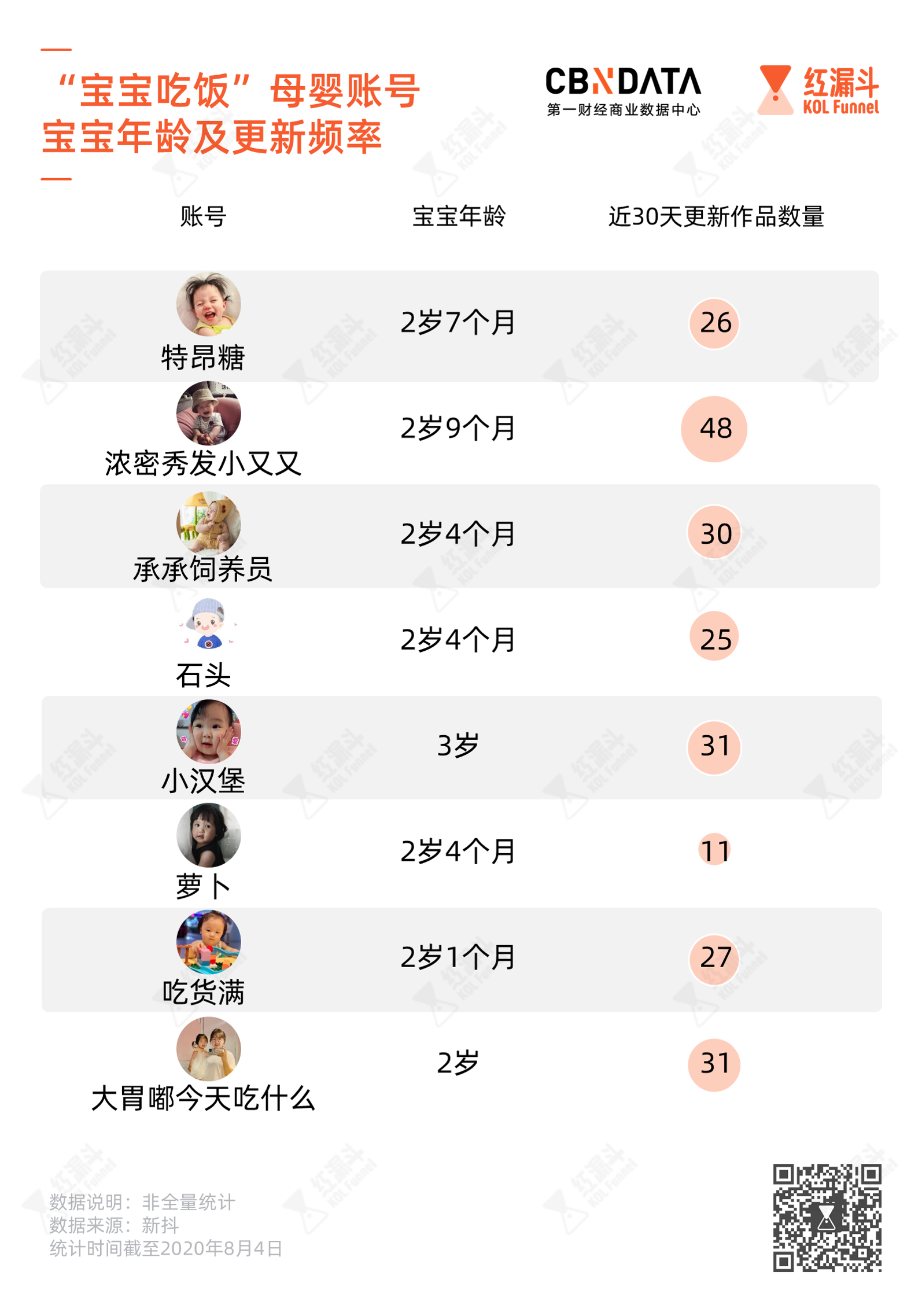 宝宝吃饭毫无疑问就是一个相对新奇、直接的切入点。这些父母保守可只专注目前的大号,倘若精力够用,则可以继续打造关于做饭教程、日常生活甚至育儿知识的账号。