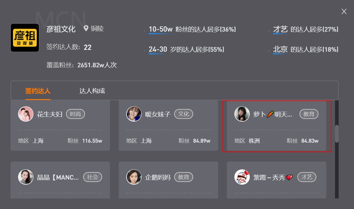 粉丝数在80多万左右的账号“吃货满”和“萝卜”分别签了湖南娱乐和彦祖文化。后者是一家非常擅长母婴达人孵化运营的MCN。