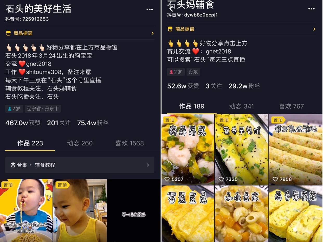 在抖音,像石头爸妈和承承爸妈这样,记录宝宝每日吃饭的账号有不少。