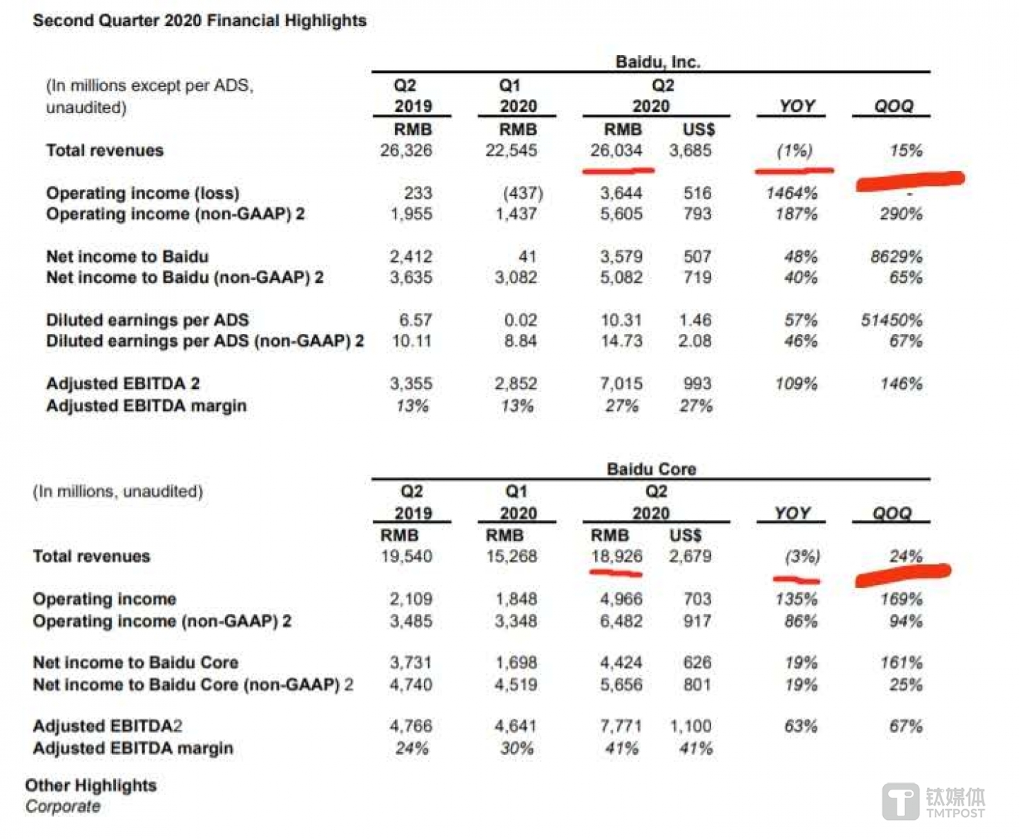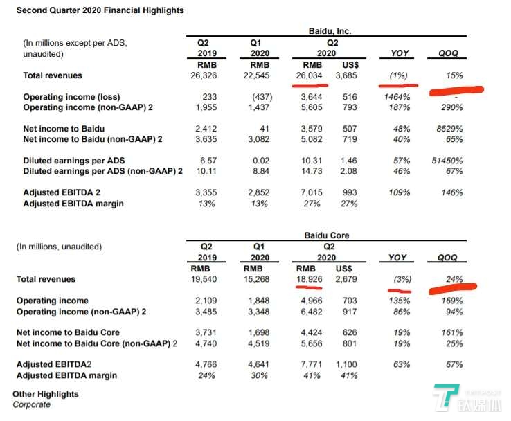 Q2百度营收和百度核心业务同比下滑,但环比有所增长