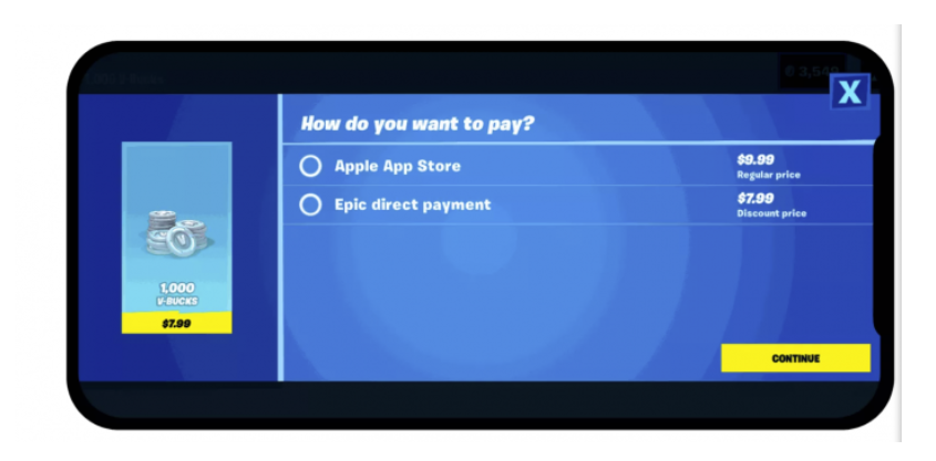 然而半年不到的时间,Epic还是选择公然挑战行业默认的七三分成。在iOS和Android的《堡垒之夜》中,Epic推出了新的直接支付选项。有别于传统支付选项,新的直接选项有折扣,用户选择会跳转至新的支付界面。