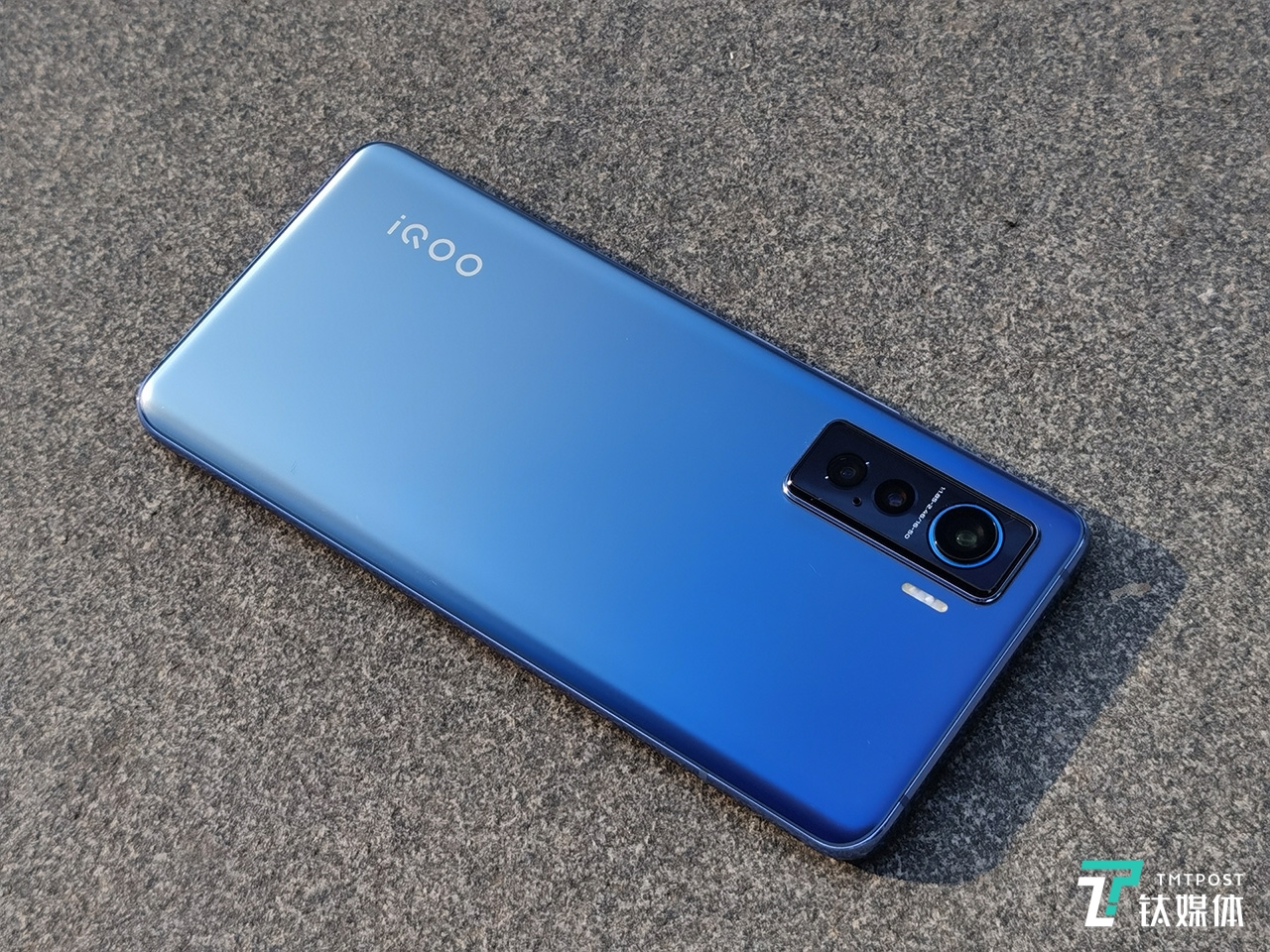 iQOO 5的配色有两种皓影、星溯,我们手上拿到的是星溯配色,这个颜色在不同的光线下发出从蓝到灰的变色,相当有质感,配合上AG玻璃材质,不容易留指纹,拿在手上也很细腻舒适。机身厚度控制在了8.32mm,仅197克重量,在目前主流性能机中,这个重量算轻的,拿在手上不压手。