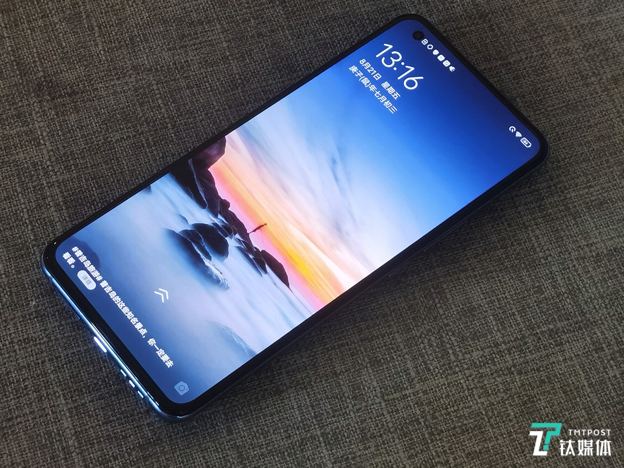iQOO 5的屏幕左右边框为1.65mm、下边框仅为2.8mm,微缝听筒部件更是几乎无法察觉,只有0.3mm的宽度,自拍摄像头位于屏幕左上方,这样的设计带来了更好的全面屏体验。