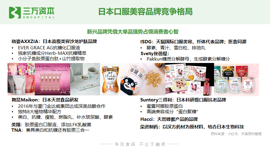 3. 护肤品品牌入场。对标日本的POLA、FANCL、DHC,护肤品品牌已经有海量用户,哪一天完美日记、河狸家做内服滋补品也说不定;