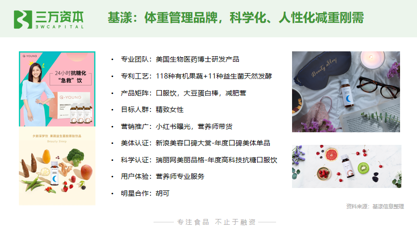 1. 本土保健品。强调功效性,对标Swisse,比如做体重管理的基漾,这个赛道的进入门槛比较高,新品牌获取用户信任也需要时间,但一旦建立品牌认知,复购和利润都很好;