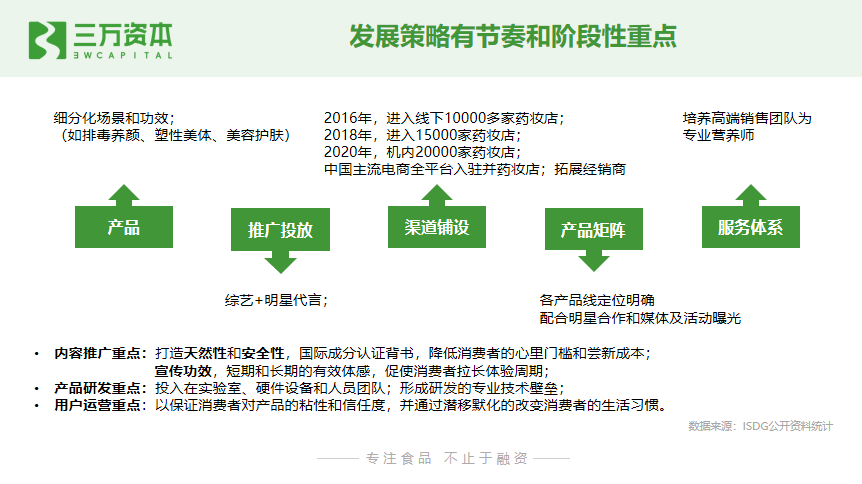 - 品类拓展。开发新品、形成产品矩阵,包括母婴、体重管理、抗衰老领域。复制现有渠道模式,通过更多的产品,扩大规模;