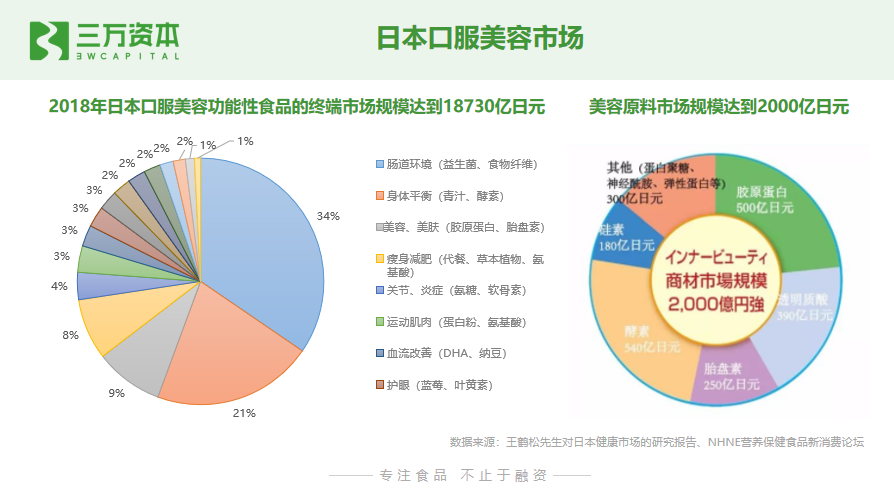 中国保健协会保健咨询服务工作委员会副会长王鹤松先生对日本健康市场的研究报告显示,2018年日本口服美容功能性食品的终端市场规模达到18730亿日元,其中以美容美体为功效的占据13750亿日元。通过供应端原料统计,仅美容终端市场规模达到2000亿日元,同比增长10%。