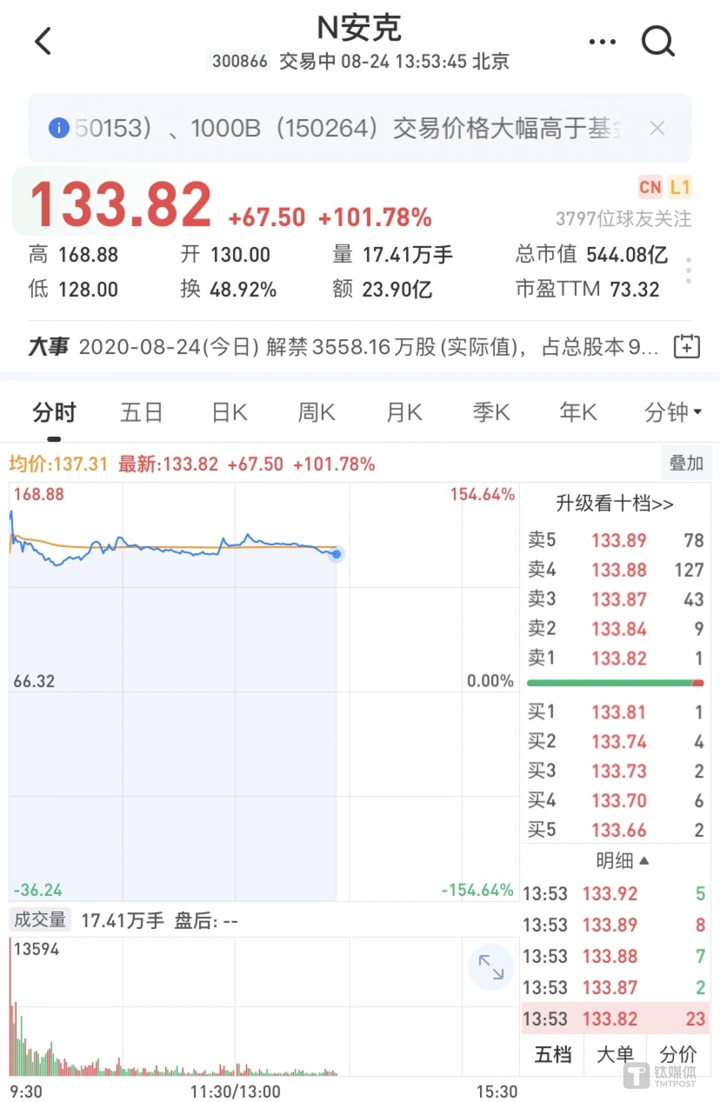 今日开盘,安克创新以130元高开,盘中触及168.88元,低点129.20元,截止发稿,为133.82元,涨101.78%,总市值544.08亿元。