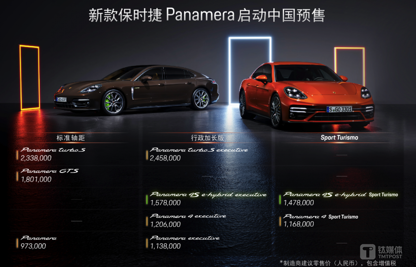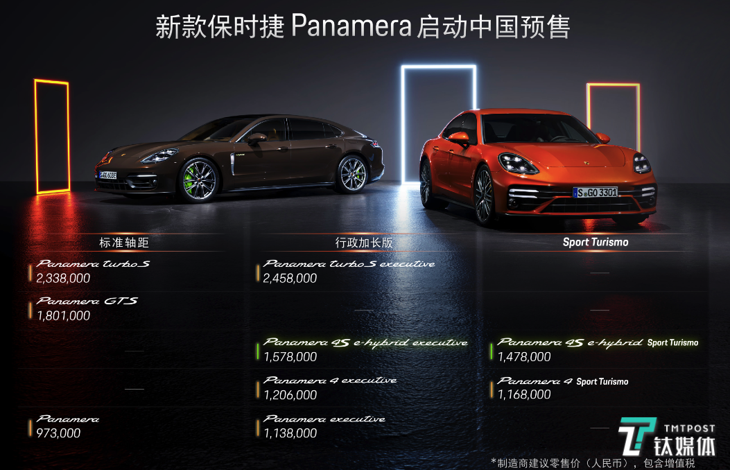 新款Panamera首批共发布9款车型,提供后驱和四驱两种驱动方式,以及燃油和插电式混动两种动力形式,同时覆盖标准轴距、长轴距和Sport Turismo三种车身形态,具体预售价格详见上图。(本文首发钛媒体,作者/Kiwi)