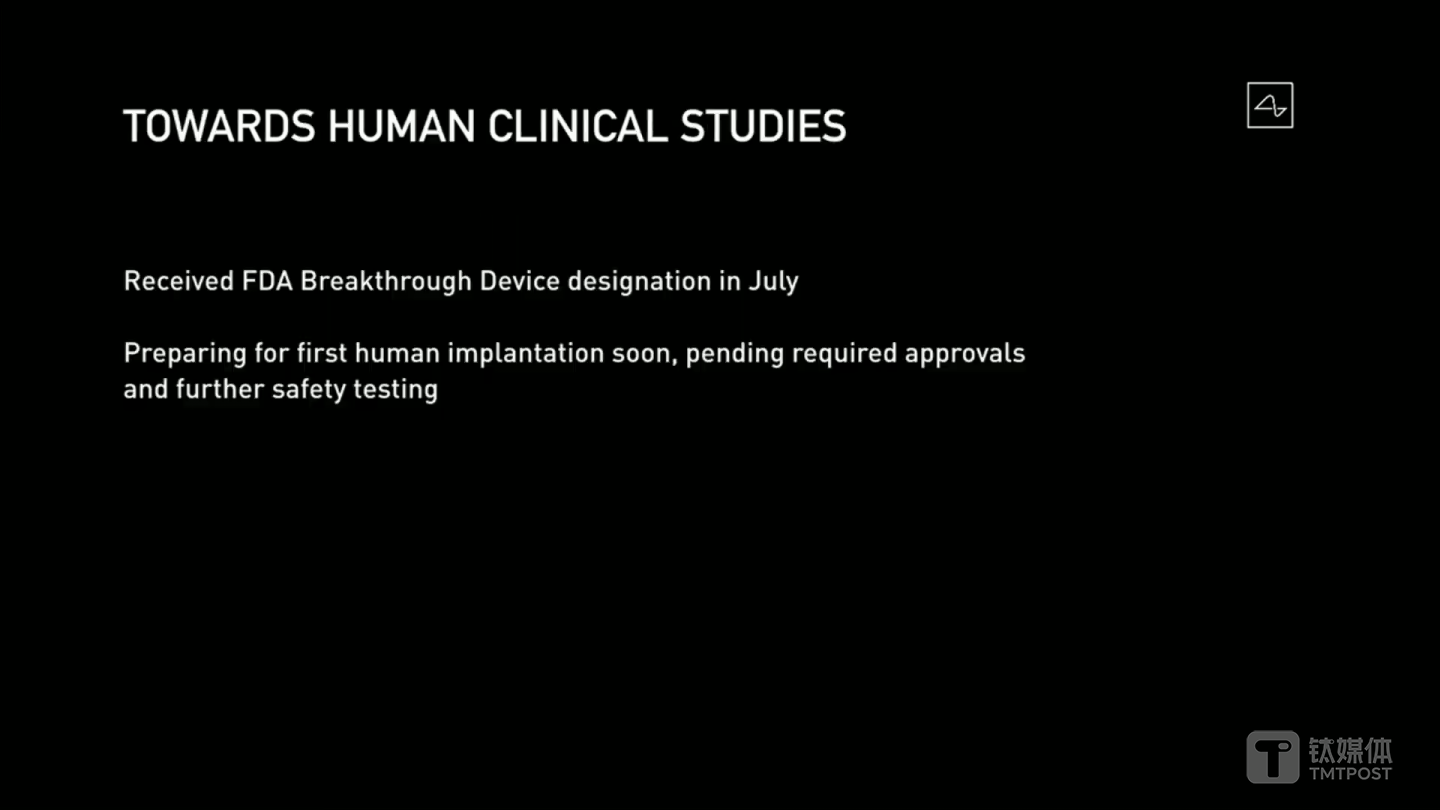 发布会上,马斯克还宣布一个重要消息:Neuralink最新脑机接口设备,已在7月份获得了FDA的“突破性设备计划”认证,即将在人类身上进行植入实验,该公司也正计划和FDA深度合作,进行更多的实验批准申报。