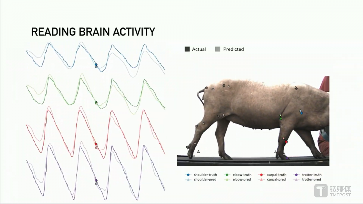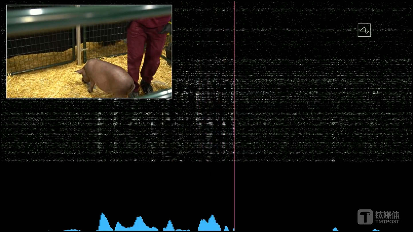 其中一只实验猪格特鲁德(Gertrude)之前接受过外科手术,现场展现了读取脑部活动的状态和此前成功预测猪行为轨迹的实验录像。