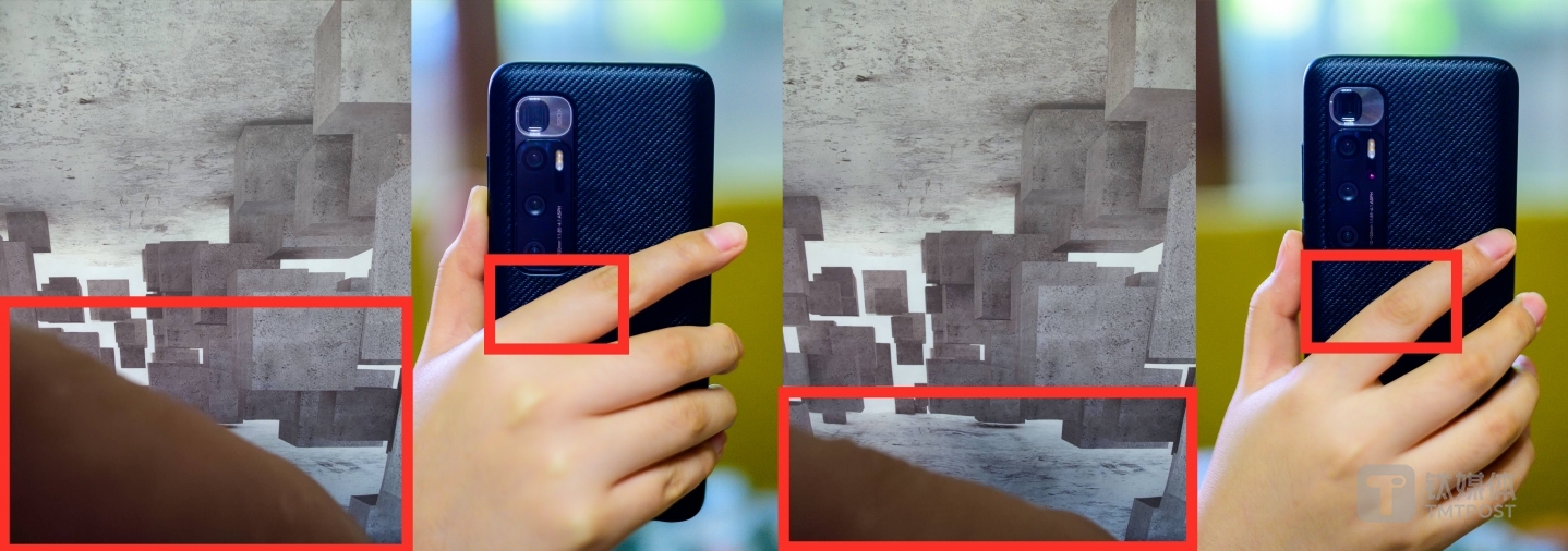 由于后置镜头的模组太大,并且是竖直排列设计,而超广角镜头又是最下方的那一颗,因此在竖屏握持下打开超广角就会看到一部分被手遮挡的部分。这里钛媒体也找到了市面上几种主流的后置摄像头设计,一方面大家可以对小米10U的后摄像头模组体积有个概念,另一方面,也更容易理解“挡手”出现的原因。