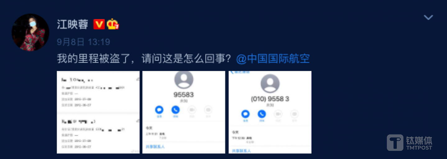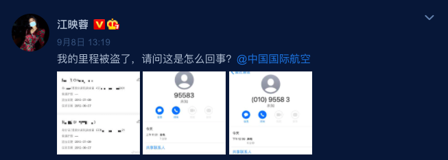 9月8日,歌手江映蓉在微博发帖,称自己的航空里程被盗。她晒出的图片显示,有两人的个人信息于2019年7月9日出现在她的中国国际航空账号中,并于2019年9月7日生效。