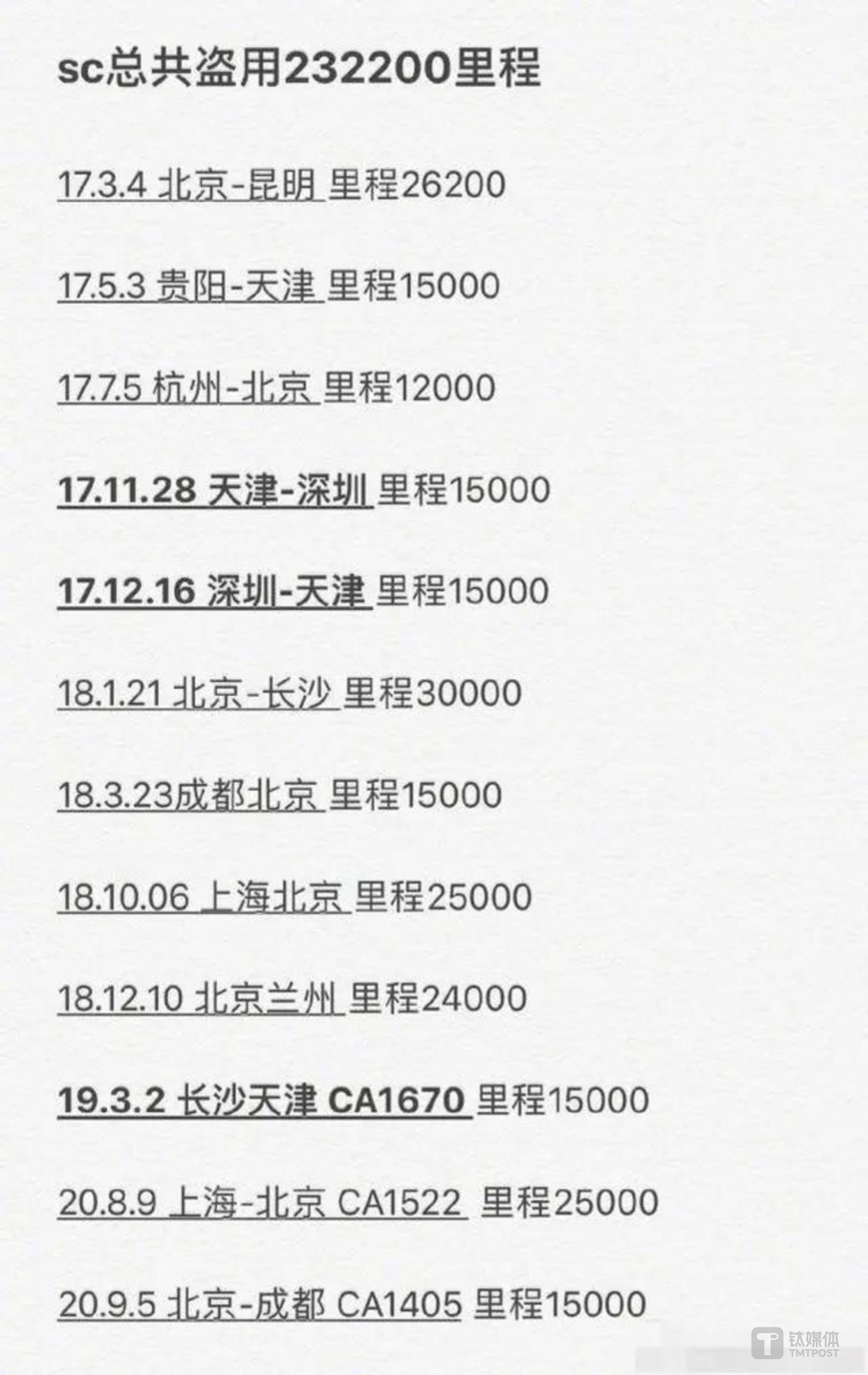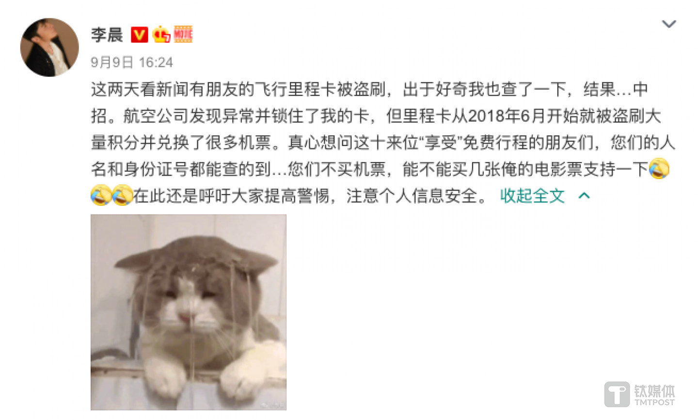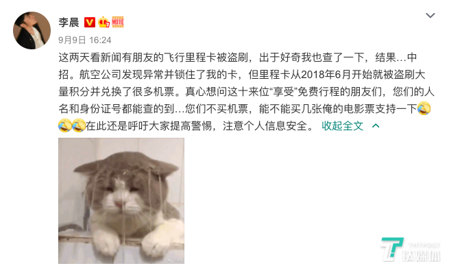9月9日,演员李晨也在个人微博上表示,其里程卡从2018年6月开始就被盗刷大量积分,有十来位陌生人使用了他的里程积分并兑换免费机票。他表示,可以查询到上述盗刷者的姓名及身份证号。