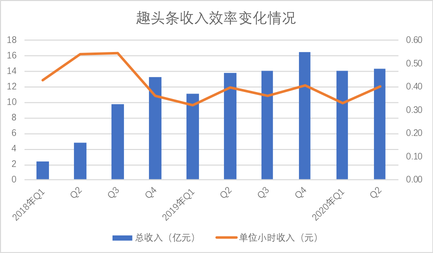 2019年以后,趣头条DAU进入膨胀期,但整体来看,单用户单小时收入基本是稳定,也就是说,招商工作大致是与用户管理保持同频增长。值得注意的是,2020年Q2,受行业竞争以及外部环境变化等因素影响,总用户使用时长环比有所下降,但同期单位小时收入却有明显增长:在宏观经济的反弹下,趣头条的用户规模优势正在放大,转化为单位广告溢价能力。