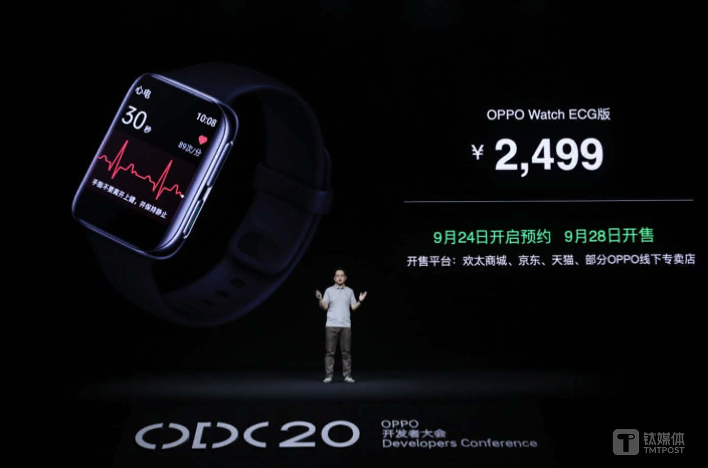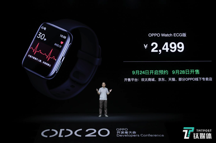OPPO Watch ECG版,也在2020 OPPO开发者大会正式发布,它是国内首家获得国家药品监督管理局(NMPA)二类医疗器械注册认证的独立通讯智能手表。(本文首发钛媒体,作者/Kiwi)