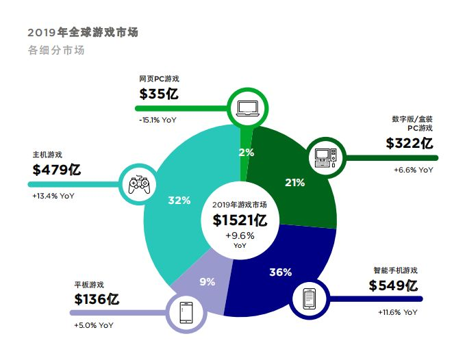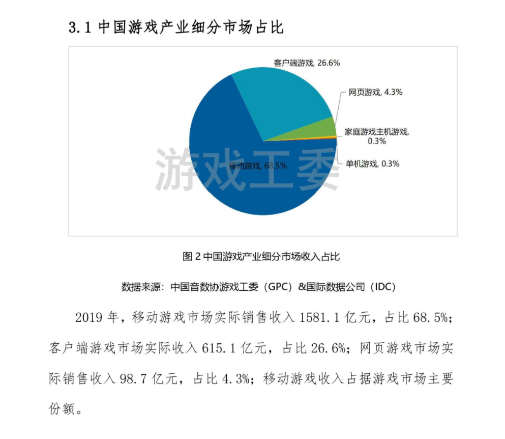 游戏工委发布的2019中国游戏产业报告显示,19年国内游戏市场实际销售2308亿元,主机游戏市场仅占0.3%。Newzoo数据显示,19年全球主机游戏市场收入为479亿美金,约合人民币3720亿元,占整体游戏市场32%,是全球第二大游戏细分市场。