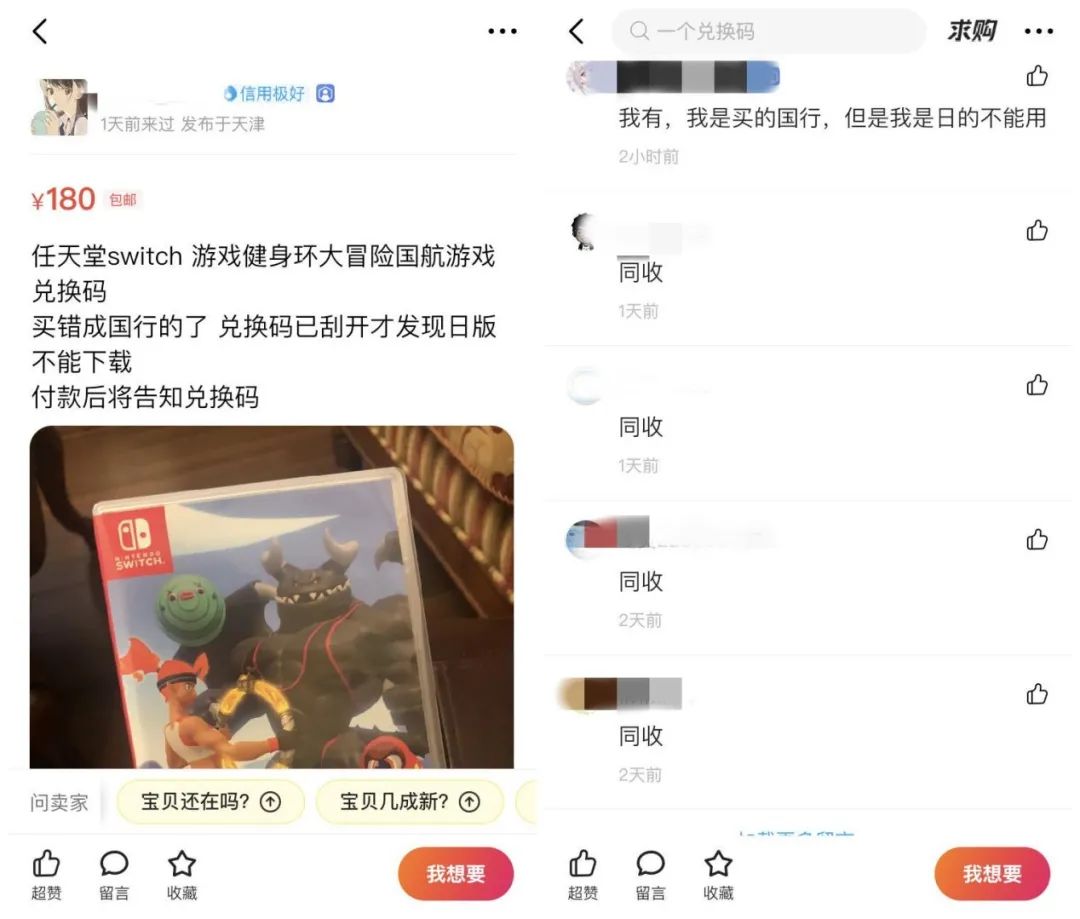 国行健身环发售后,二手交易平台闲鱼上出现了两大群体,买、卖健身环国行游戏兑换码的人。