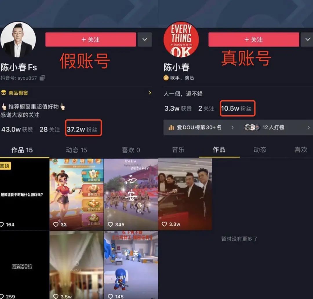 粉丝数最多的高仿号是“陈小春Fs”,抖音粉丝达到37.2万,而陈小春认证的抖音账号也只有10.5万粉丝。