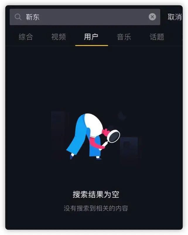 在抖音搜索“靳东”,词条也已经完全清空。我们推测,一方面是抖音对于高仿账号的主动整治,清空和封禁一系列涉事账号;另一方面,一些高仿号主动改名或将账号设置为私密账号,以免被平台查封。