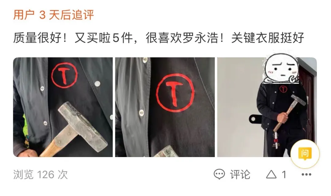 十多天前,一位买家还晒出试穿照:手上拎一把大锤举在胸前,“又买了5件,很喜欢罗永浩,关键衣服挺好”。