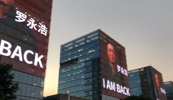 10月14日,有一场他和二手物品交易平台转转合作的营销活动。深圳华强北的巨幅广告牌上,打响了老罗“I’m back”口号,一点都不巧的是,同一天还是苹果新机发布会——收购苹果是他锤子时期的一句名言。