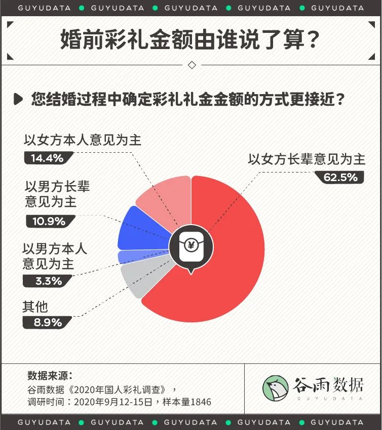 调查显示,有62.5%的彩礼金额是由女方长辈确定,14.4%由女方本人确定,加起来就是女方占了快八成。在这个问题上,只有3.3%是基于男方本人的意见。