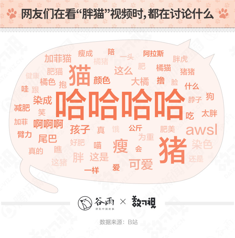 谷雨数据在B站上以“胖猫”为关键字进行搜索,得到了大量结果。我们爬取了弹幕数量最多的五条视频,看看当猫奴们在看胖猫视频的时候,都在谈些什么。