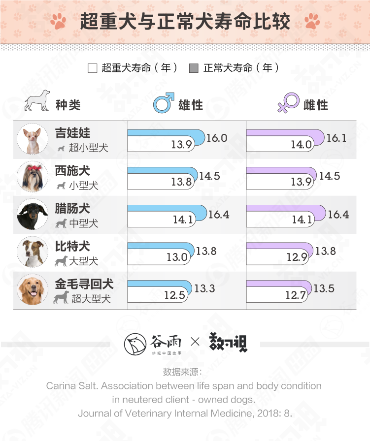 在狗狗的身上也是同理。有研究发现,超重犬的瞬时死亡风险高于正常犬。一只超重的雄性吉娃娃平均寿命是13.9年,比正常体重的雄性吉娃娃少了2.1年。