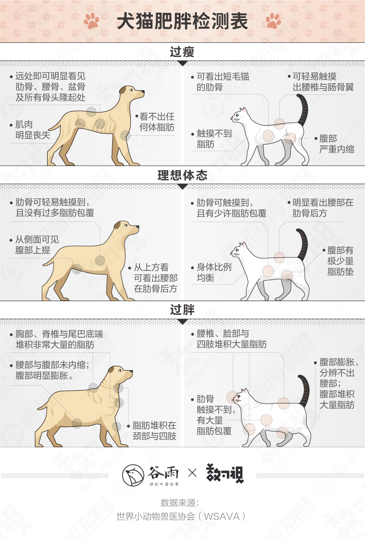 铲屎官们还可以利用体况评分(BodyConditionScoring,BCS),靠视觉和触觉来判断宠物的营养状况。BCS评分标准中,1-3分为过瘦,4-5分为理想体态,6-9分属于过重。