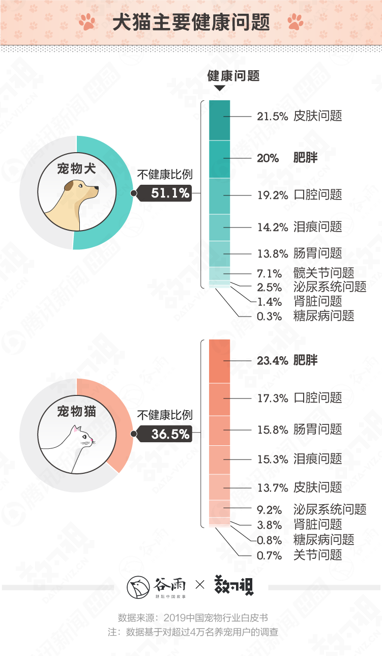 胖,成为威胁宠物健康的头号杀手。2019年,存在健康问题的宠物中,受肥胖问题困扰的宠物犬达到20%,宠物猫占23.4%。