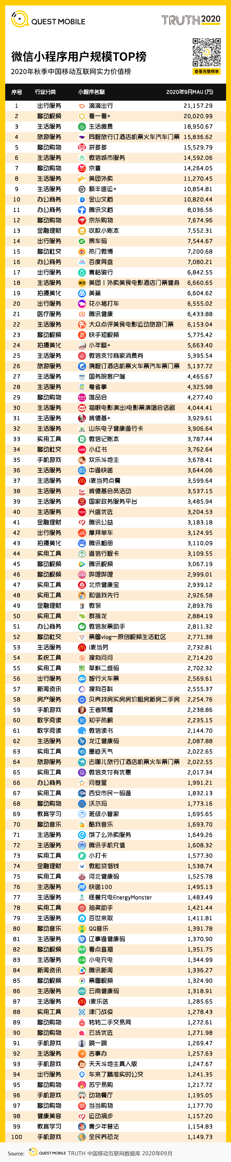 微信小程序用户规模TOP榜